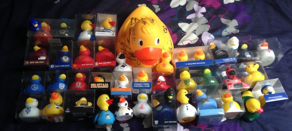 I marked completing the 92 with the presentation of a jumper from my parents and the following day I had a giant duck signed by all the Leicester players presented to me by city hero Steve Walsh 🙂 another surprise my parents arranged! I suppose the duck story needs explanation … I collect rubber bath ducks on my journeys to the football grounds well the grounds that sell them anyway I then name them after a player who has played for both Leicester and the club and where possible get them signed!!