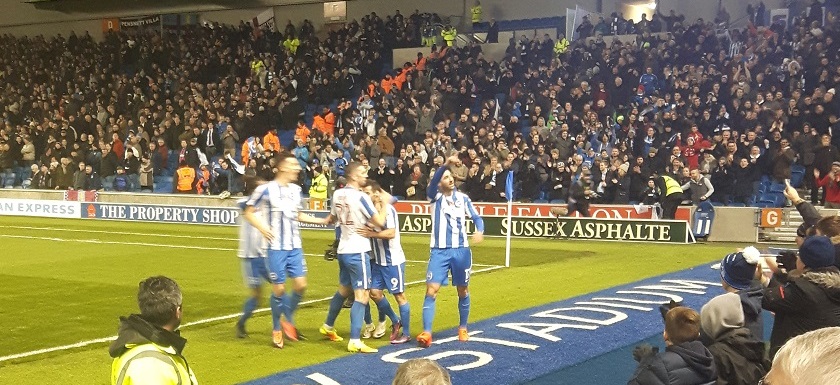 Brighton enjoyed some good early possession but were unable to carve out any clear cut chances. Danger man Anthony Knockaert was well martialled by Villa left back Jordan Amavi, often with the assistance of the back tracking Jonathan Kodjia. When the ball turned over Villa were always looking to break quickly, but similarly to their hosts often their play with a tad disjointed. They did take the lead though with 20 minutes on the clock. A central free kick from midway inside the opposition half was taken by Adomah, and in all honesty looked under hit. However Villa centre half Nathan Baker timed his run well and his glancing header couldn’t be kept out despite a hand from Stockdale.