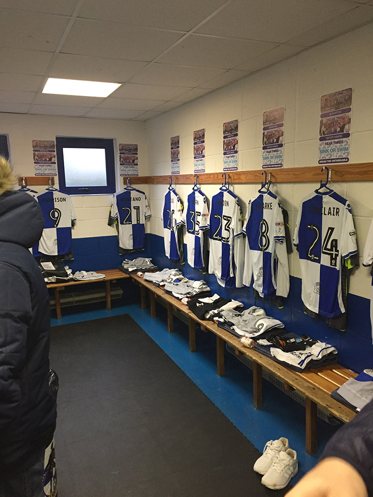 As we were standing alone near the pitch two rather official looking men in Bristol Rovers suits and coats asked us what we were doing. Again, we mentioned our quest ‘doing the 92’ and the fact we had travelled 300 miles from the North East. This is when the unbelievable happened. They showed us the corporate facilities in the East stand, which were quite impressive. From the outside the stand looked odd only covering the middle third of the pitch but with a terrace running the full length. We were then taken across to the main stand. We were escorted down the tunnel and introduced to the Bristol Rovers manager Darrel Clarke. Following that we went into the home dressing room and chatted with ex-Sunderland player Marcus Stewart who is the Assistant Manager. Even as a Newcastle fan, I shook his hand and thanked him for his time. A quick peak into the away dressing room was followed by a look upstairs to the chairman’s box. This was by far so much more than anything we could have expected.